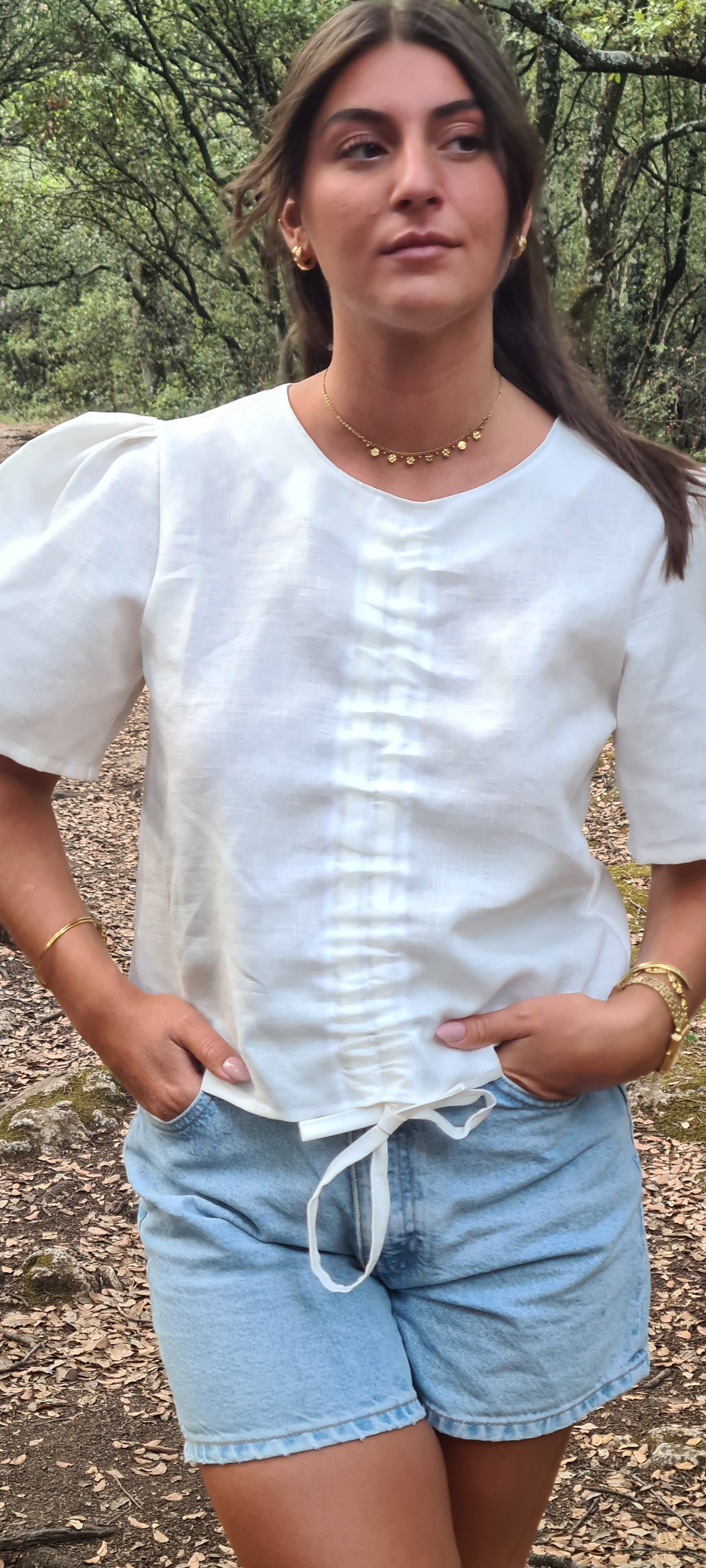 100% linen white blouse, loose fit, puffed sleeves, for a trendy and timeless look.